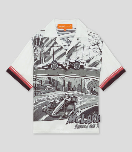 Experience the thrill of the Suzuka race with our Reiss x McLaren Formula 1 Mens Suzuka GP Print Cuban Shirt. Made with a cool, lightweight fabric and featuring a hand-drawn comic-style print, this Cuban collar shirt is perfect for race day.