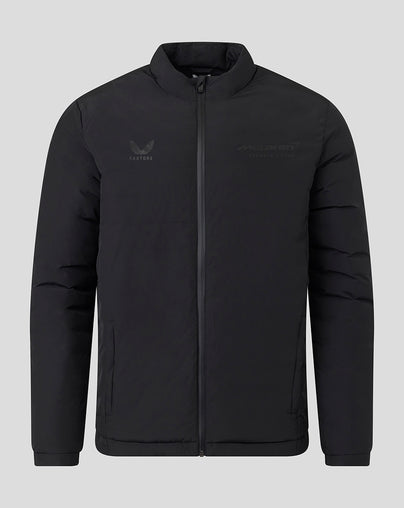 This unisex McLaren Formula One Team Black On Black Padded Jacket combines sleek design with functional insulation, offering optimal warmth and comfort.
